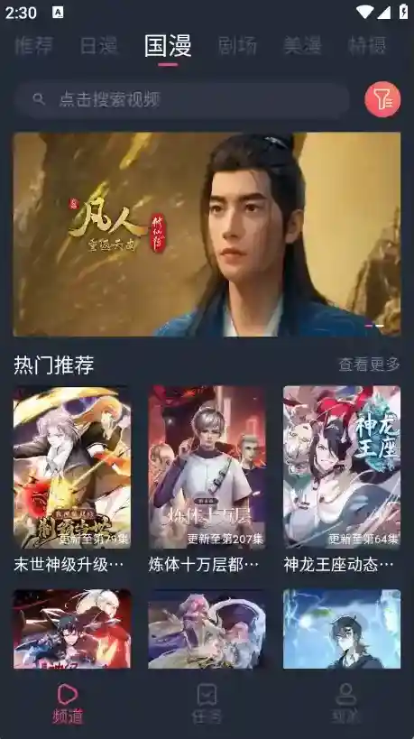 2、频道页面包含了很多的动漫资源,日漫、国漫以及韩漫等都有。